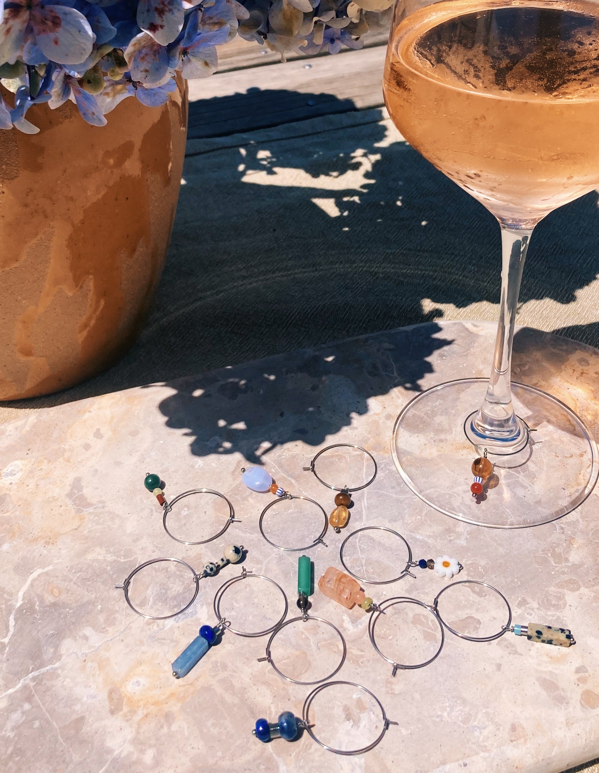 Handmade and designed on the northern beaches using variations of natural gemstones and handmade glass beads, finished with kitchen grade stainless steel wine glass rings. These wine glass rings are the perfect solution for entertaining. With unique and practical individual designs, you'll never forget which glass is yours again. Practical and stylish, these rings are a must-have for any host.